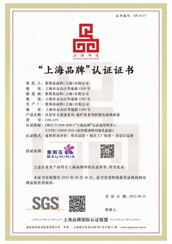 近日,紫荆花品牌旗下贝倍安儿童漆系列与超护家系列舒敏抗菌墙面漆产品荣获由上海品牌国际认证联盟(SGS)颁发的“上海品牌”认证证书。“上海品牌”认证面向全社会开放,由企事业单位或其他社会组织自愿申请,旨在推动组织持续满足用户及相关方需求、持续保持创新的动力、持续引领行业 高质量发展。此次紫荆花获得该项权威认证,也是对紫荆花绿色制造之路的又一肯定与认可。