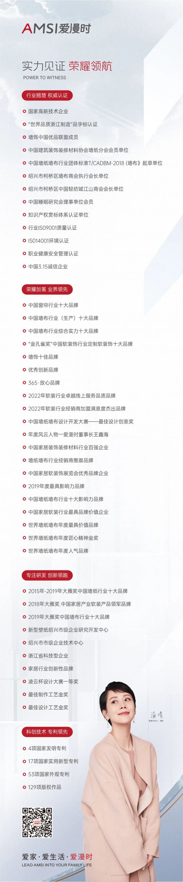 截止目前,爱漫时荣获4项国家发明专利,17项国家实用新型专利,53项国家外观专利以及129项版权作品。牵头和参与的国家标准、地方标准及行业标准近十项。