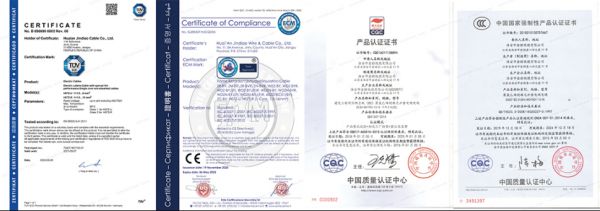 金貂阻燃电线产品已通过了德国TÜV安全认证,欧盟CE安全认证,国家CQC防火认证,国家CCC强制认证,产品质量达到国外先进水准,以高品质要求满足国内市场需求。