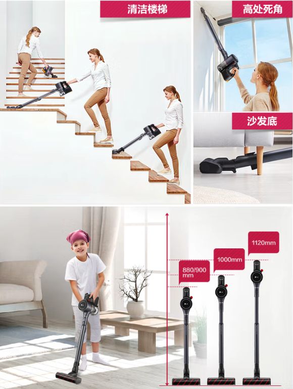 A9K-MAX另一项非常人性化的设计,就是4挡调节吸杆,900mm-1120mm的长度,非常符合人体工学,满足家里每一位成员的需求。