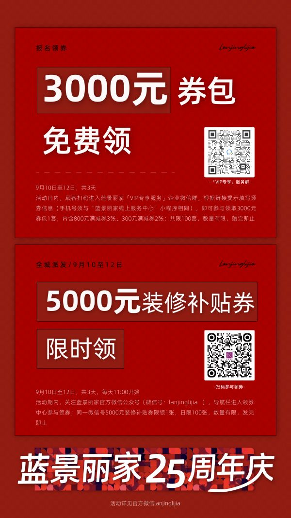 中秋三天关注蓝景丽家微信公众号(微信号:lanjinglijia)可免费领取面值5000元、800元、300元、100元装修消费满减券。持券购物可享受满10000立减800、满5000立减300、满3000立减100,以及满10万立减5000大额补贴。