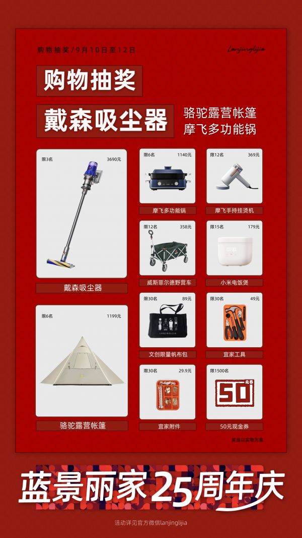 活动期间购物满额参与蓝景丽家抽奖活动,即有机会赢取戴森吸尘器、骆驼露营帐篷、摩飞多功能锅、摩飞手持挂烫机、威斯菲尔德野营车等心动礼品。