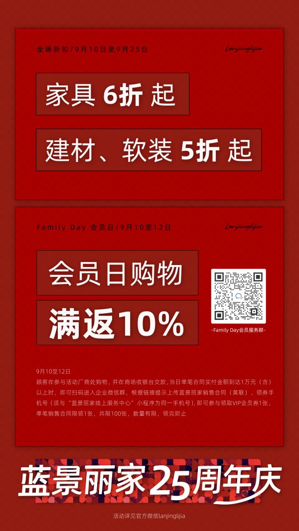 金秋九月,蓝景丽家迎来了25岁生日,为感谢广大消费者多年来的支持与信赖,特别推出“25周年店庆”活动,大额补贴、满减优惠、免费券包、购物抽奖,狂发千万装修福利盛大回馈!