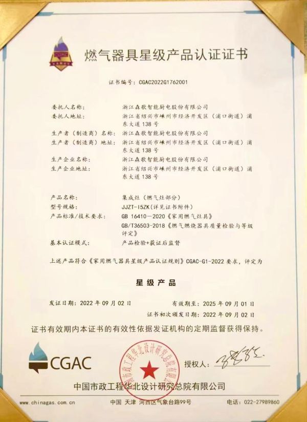 「高燃时刻」森歌实力再添权威认证,i5zk荣膺“燃气器具星级产品认证”!