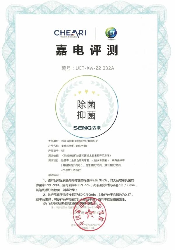 努力是否有结果?最后我们都看到了。此次森歌发布的U5除菌集成洗碗机达到了权威认证的四星级除菌抑菌标准,其对于金黄色葡萄球菌、大肠埃希氏菌的除菌率≥99.999%,病毒去除率≥99.99%!作为行业首台,U5有着行业内最高标准、最好效果的除菌抑菌性能,这也是市面上多数消毒类洗碗机产品所不具备的。
