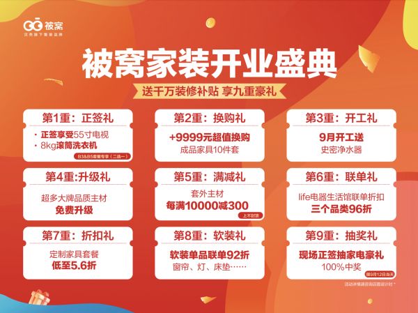 9月12日,被窝家装世纪金源旗舰店在北京市海淀区板井路59号正式开业。新店占地面积约3100㎡,内含4大实景情景区,将为消费者带来一站式品质整装新体验!至此,被窝家装“东南西北”四向店面全部落成。 据悉,9月开业盛典期间,被窝家装将补贴百万装修基金,并推出家电家具超值换购、免费升级、签单即赠等优惠活动,以九重“豪”礼助力业主打造“理想家”。