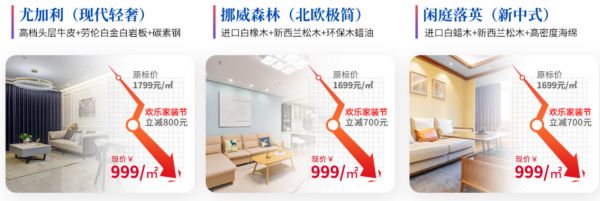 经典样板房享心动折扣价,原价1799元/㎡的尤加利、原价1699元/㎡的挪威森林、原价1699元/㎡的闲庭落英,均可以999元/㎡元的折扣价拿下。同时全包圆中式、新中式、北欧风、美式、简约、轻奢、日式等近几十款各类流行风格样板间,均有不同利惠可享。本次全包圆“欢乐家装节”降价不降质,肉眼可见的实惠可谓诚意十足。
