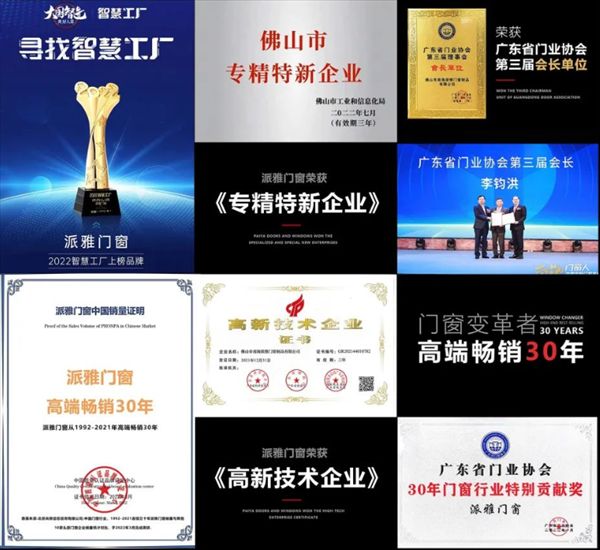 2022年,派雅当选为广东省门业协会长单位,被授予“30年门窗行业特别贡献奖”,获评“高新技术企业”。同年,入选CCTV-1央视《大国品牌》,以行业领导者姿态进入“品牌国家队”,用硬实力铸造大国品牌闪亮名片。
