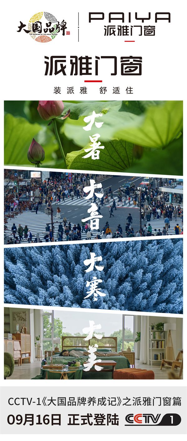 更多精彩,锁定9月16日CCTV-1《大国品牌》派雅门窗故事片全球首映礼,听派雅门窗讲述中国门窗品牌故事,新浪家居将全程直播报道。