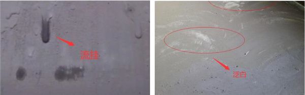 掺水后,会导致防水浆料过稀。过稀的浆料涂刷上墙后,往往会出现严重流挂,如要在上面贴砖,还必须先把流挂的区域铲掉,这就会破坏了防水层。除此之外,也容易引起防水层的泛白现象,会让整个防水效果难以保障。