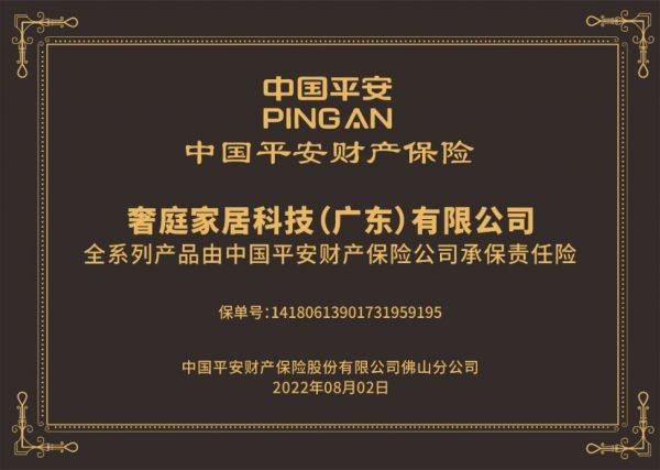 2022年8月2日,奢庭家居科技(广东)有限公司旗下品牌“奢庭门窗”顺利通过中国平安财产保险股份有限公司审核,在中国平安财产保险股份有限公司佛山分公司举行签约仪式,为奢庭门窗全系产品购买责任险。投保全系列门窗及配件和产品责任险,保证消费者的家庭人身和财产安全。