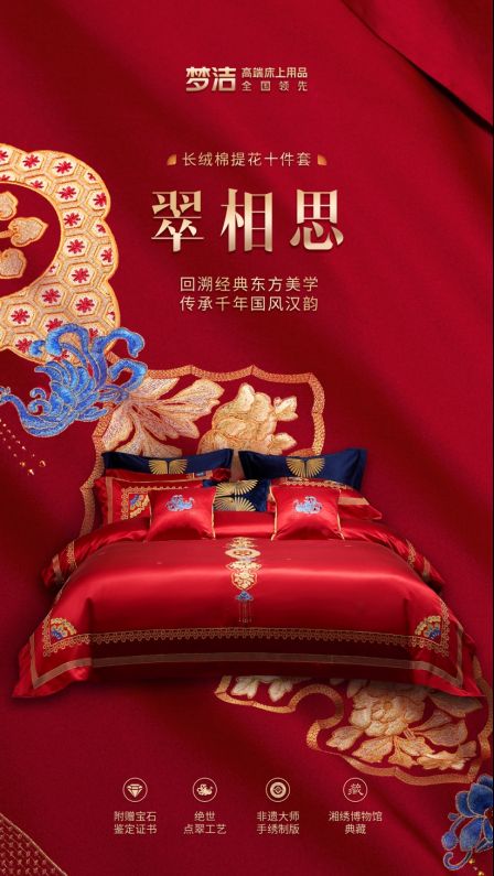 梦洁,作为拥有66年历史的高端床品品牌,100%精选原料与设计,凭借翠相思、敦煌传奇等多款婚庆系列产品,成功入选2021环球文化趋势案例。