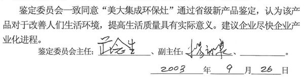 2003年9月26日,浙江省科学技术厅对“美大集成环保灶”产品组织鉴定,鉴定委员会由中国建筑设计研究院、同济大学、清华大学、中科院电工研究所、浙江大学、浙江省质量技术检测研究院7位教授和高级工程师组成。鉴定委员会一致同意“美大集成环保灶”通过省级新产品鉴定。2003年9月29日,浙江省科学技术厅批准该鉴定,并出具《科学技术成果鉴定书》(浙科鉴字[03]第263号)。