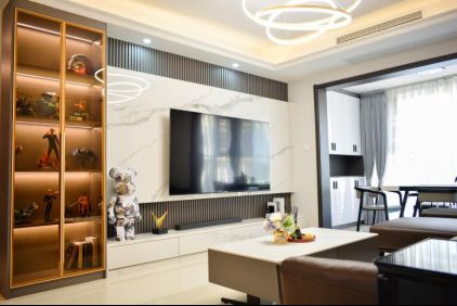 电视背景墙同样简约大方,白色大理石电视背景墙,木格栅与白色雪花纹大理石的组合搭配,刚柔并济,冷暖协调,让整个空间显得非常大气且层次分明,电视墙的左侧设计成了展示区域,增加空间的精致感同时更让生活充满仪式感。