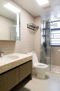 卫生间做了干湿分离,空间格外的宽敞,洗手台选用了大理石台下盆,相比传统的这种面积更大些,且不容易积水,下方还有可以收纳的柜子,既美观又实用。