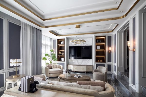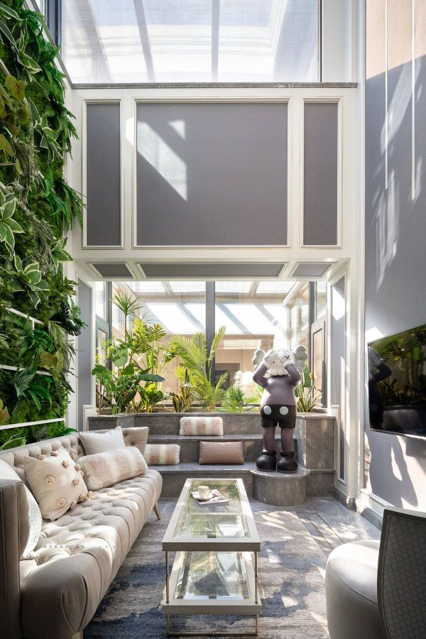 【赵艺哲】:在《金都夏宫》项目中,家里的小孩子从小国外长大,一家三口在满足中外生活习惯有差异的基础上,所以如何保证在450方的房子内居住起来舒适且不觉得空旷无趣,保持隐私且又有互动联系成为了这个房子设计的重点,因此利用这个别墅的天井活动室实现了自然与人文的和谐共存,空间挑空铺陈开来,形成一种互动感,而恰恰是这互动感映射出了别墅才有的气韵:家人拾级而坐抚栏对饮,宛如悠扬恢弘的交响乐章。
