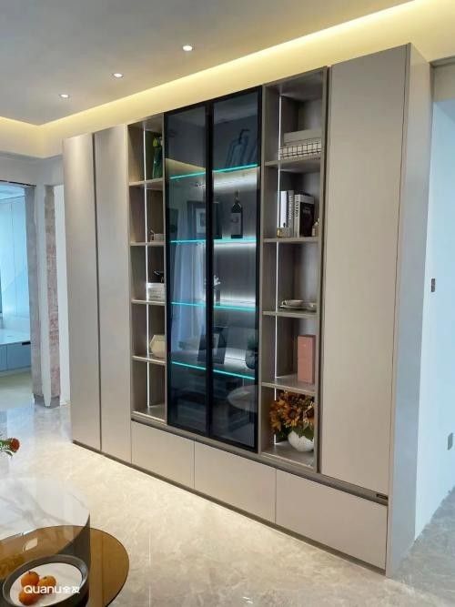 餐厅定制同系列整墙餐边柜,顶天立地设计拥有超大储物空间,完全满足了宣先生一家的收纳需求,部分柜门采用透明玻璃,在收藏展示各类美酒的同时又可以防尘。