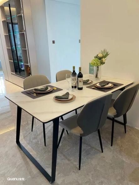 岩板餐桌台面纹路自然细腻,灰蓝色餐椅低调优雅,细腿设计赋予餐厅呼吸感,让小户型空间更显通透。