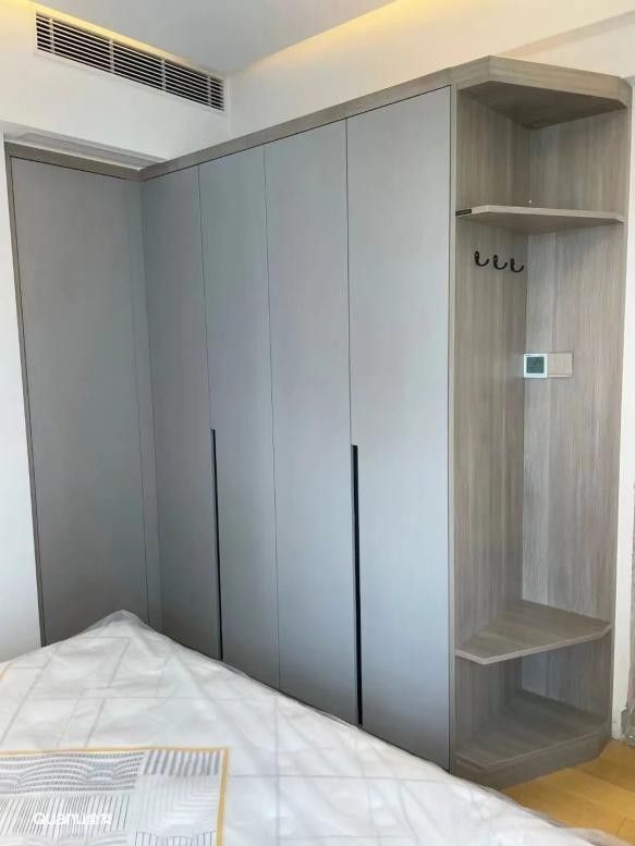 床尾处贴合户型内嵌L型衣柜,空间不浪费。超高门板+内嵌式拉手设计,时尚大气,彰显出简约格调,柜体最外侧还做了异形开放格,让衣物的挂放更方便顺手。