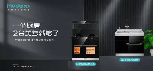 美多一站式整体厨房解决方案将厨房清洗区、准备区、烹饪区合理布局,美多语音集成灶+美多集成水槽洗碗机以小体积释放大能量,省力又高效。