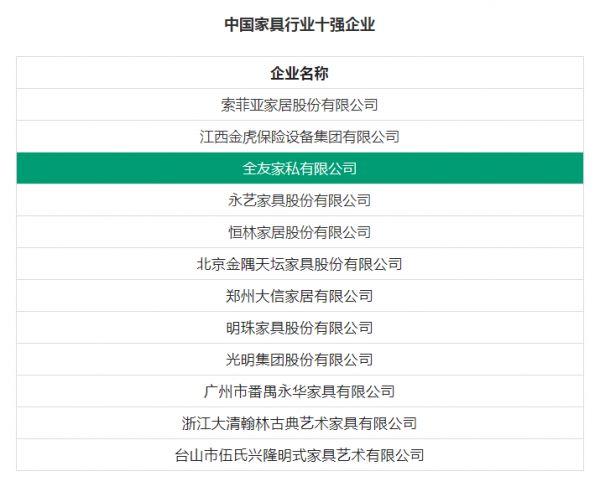 实力创新并举,全友首次荣登“中国家具行业十强企业”城市
