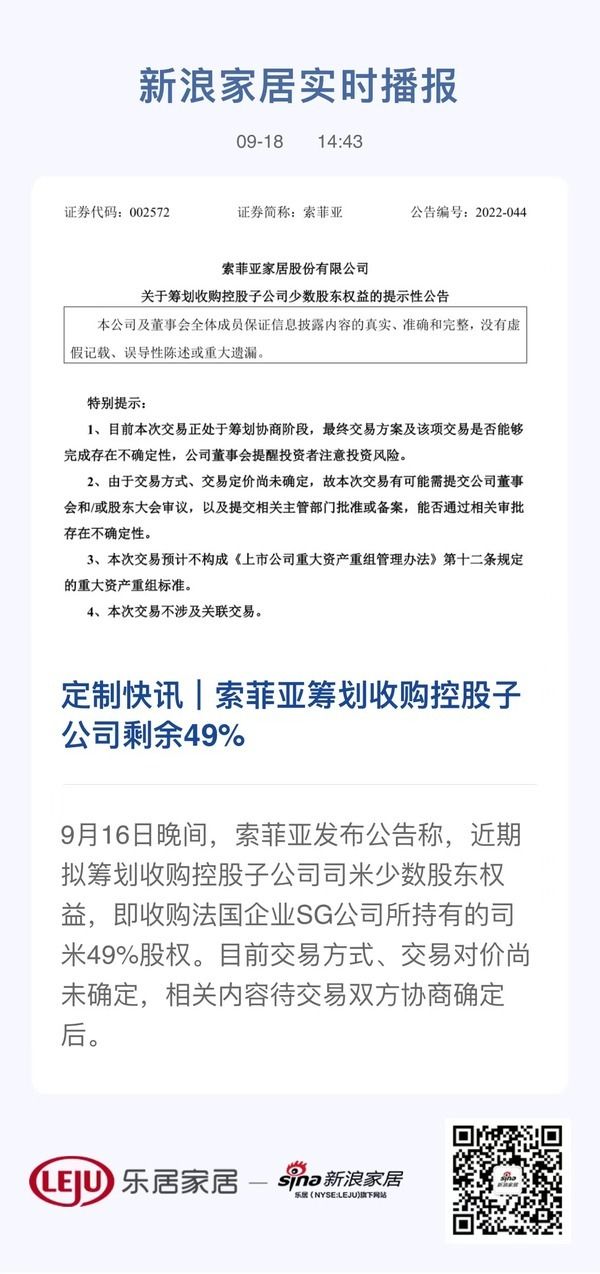 新浪定制频道讯 9月16日晚间,索菲亚发布公告称,近期拟筹划收购控股子公司司米少数股东权益,即收购法国企业SG公司所持有的司米49%股权。目前交易方式、交易对价尚未确定,相关内容待交易双方协商确定后。