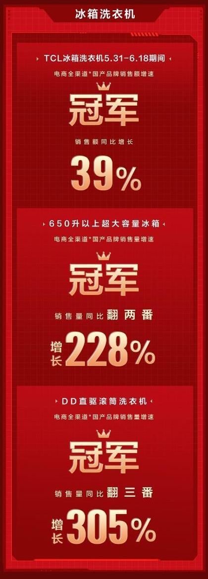 但你或许不知道,TCL在白家电领域也有亮眼的成绩。数据显示,今年上半年中国家电市场实现零售额3389亿元,同比下滑9.3%,但618期间,TCL 600L超大容量冰箱同比增长246%,TCL DD直驱滚筒洗衣机同比增长106%,分别成为650L大容量冰箱品类全渠道销量第一、洗衣机电商渠道国产品牌第一,逆势增长让人惊喜。