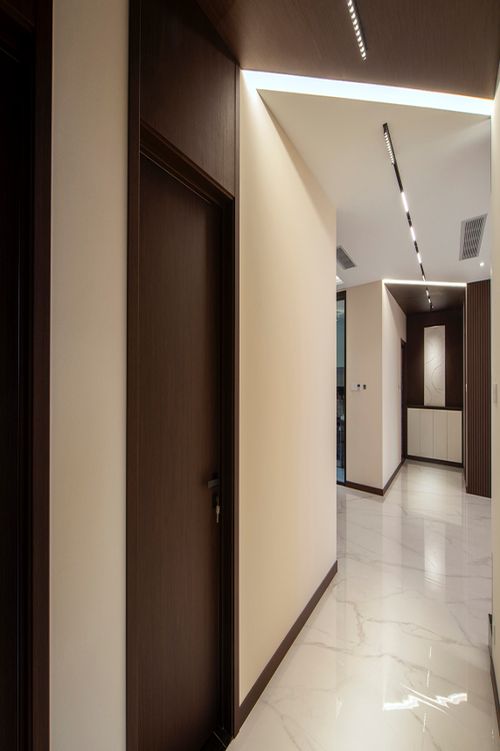 本案围绕化繁为简的设计思路,让空间更简洁有质感,用线条打造层次,简约不简单,墙面以暖色为主基调的让整个空间显得更加温馨,走廊顶面斜切处理,打破常规,让人眼前一亮