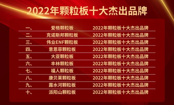 众所周知,颗粒板已经成为家装领域、家居领域的常用板材,市面上的颗粒板板品牌很多、质量也参差不齐,哪些品牌质量过硬?哪些产品值得选购?带着这样的主办使命和责任感,组委会秉承公开、公正、公平的原则,专家团队对每一品牌进行质量性能、甲醛释放量、握钉力、抗压能力等物理性能测试数据收集和比较,旨在遴选出颗粒板十大杰出品牌。最终入围榜单在近日公布,伟业ENF颗粒板等荣登榜单,以下是“2022年颗粒板十大杰出品牌榜单“的入选品牌: