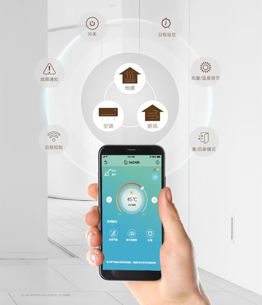 大金家用中央空调+新风+地暖智联一体的舒适系统,可以通过智能控制提升室内空气品质,解决多种空气问题,时刻保持室内新鲜空气流动。一个手机APP即可轻松控制全屋*2,统一品牌,统一售后,品质可靠,后期设备的维护保养也能更省心。