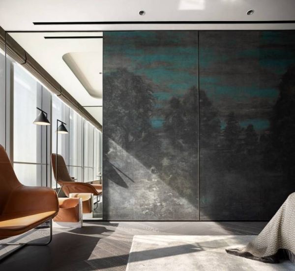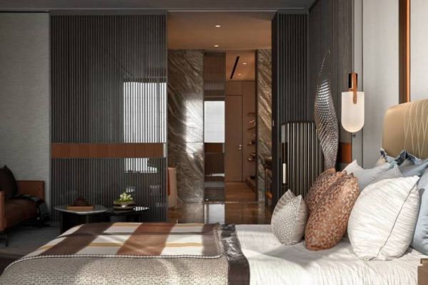 主人睡房休息区设有落地电视与音响酒柜,配合从格栅背后透出淡淡的橙光,舒缓一天的疲惫。右手边折叠的米色编制皮革床背景墙,灵感来源于中国古代的屏风元素。精选壁纸突破统一化和样式化,丝绸和金属线制作而成的涂漆呈现出了更为别致的高级金属质感,给人如置身大自然的感觉。次主卧空间以优雅的米色为主色调,宽敞的落地窗让优越的采光发挥到极致。