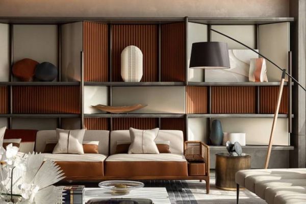 沙发后方是艺术品陈列区,以开放形式呈现,陈列墙的设计灵感来源于日本建筑大师阪茂设计的纸管建筑和传统苏州折扇的造型,用橘色和优雅米色皮革结合木饰面及古铜金属材质重新组合,呈现出富有东方韵味及现代奢华体验的艺术品展区。