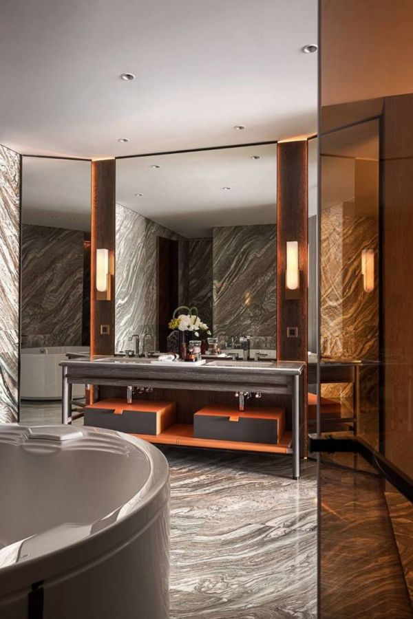 主人衣帽间采用奢侈品店的设计布局,置有一整面墙的陈列架及两个中岛展示柜,宽敞明亮,配合大容量衣柜,展现精致生活。穿过衣帽间是半敞开式的浴室空间,四扇玻璃移门增加自然采光,绿野仙踪大理石优雅别致,双台盆设计及独立式浴缸展现出空间的尺度。透过一面超大的格栅玻璃门可以把卧室区的采光纳入主卫,同时很好的兼顾私密性。独立式浴缸、家具式台盆柜设计及屏风造型镜子等,处处体现了高级奢华感及工匠精神。