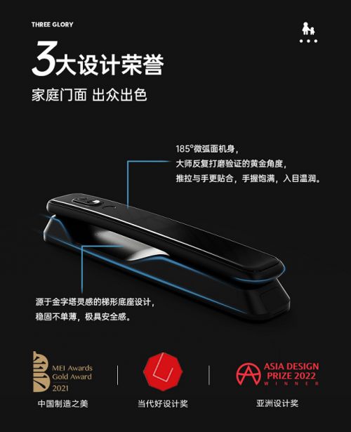 好太太V86S智能锁一改铁将军的冰冷设计,以灵动之美荣获中国制造之美、当代好设计奖、亚洲设计奖三项设计大奖,成为当之无愧的家庭门面担当。185°微弧面机身,大师反复打磨验证的黄金角度,推拉与手更贴合,手握饱满,入目温润,外加源于金字塔灵感的梯形底座设计,稳固不单薄,极具安全感,出众更出色。