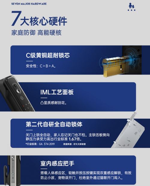精选品质硬件,让高能防御不是空谈。安全等级最高的C级黄铜超耐锁芯,凸显质感、耐刮花的IML工艺面板,可使用移动电源临时供电的5000mAh集大容量锂电池,主锁舌板侧向静压力承受力高出行业标准1.67倍的第二代自研全自动锁体,防止小孩和宠物外出的室内感应把手,室内电子反锁,机械应急旋钮……里里外外高能硬件,把安全落实到每一处细节。