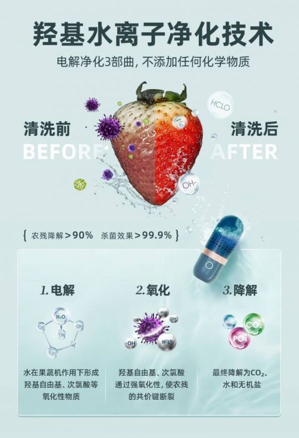 效果才是硬道理,市面上的果蔬清洗机基本都采用羟基水离子净化技术,既能有效杀菌去农残,还不会破坏食材营养和口感。所以,我们购买果蔬清洗机的时候,要优先选择采用羟基水离子净化技术的品牌,可以少走很多弯路。