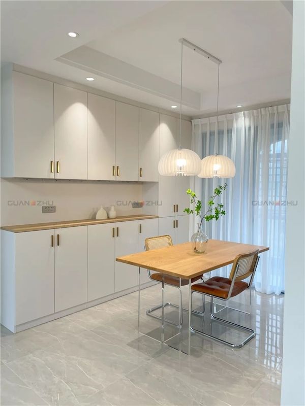 餐厅在冠珠劳伦白金浅灰瓷砖营造的温柔氛围中,依墙定制的白色餐边柜和原木餐桌为餐厅增添了清新自然感,设计精巧的吊灯和青翠的绿植更是一整个空间的点睛之笔。
