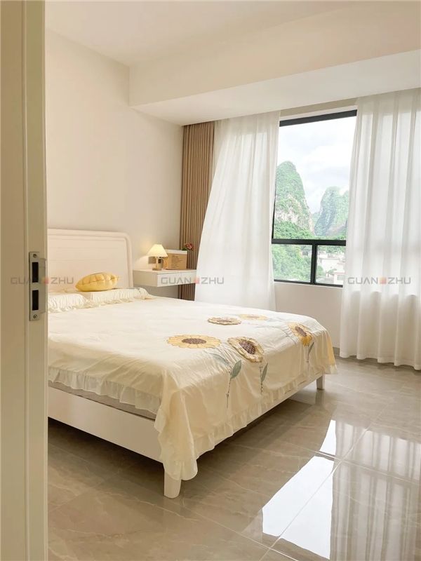 卧室墙面和客厅一样是淡奶茶色调,选择白色窗帘搭配冠珠劳伦白金浅灰瓷砖,摒弃繁杂的设计,打造清透感,让睡眠空间舒适又幸福。