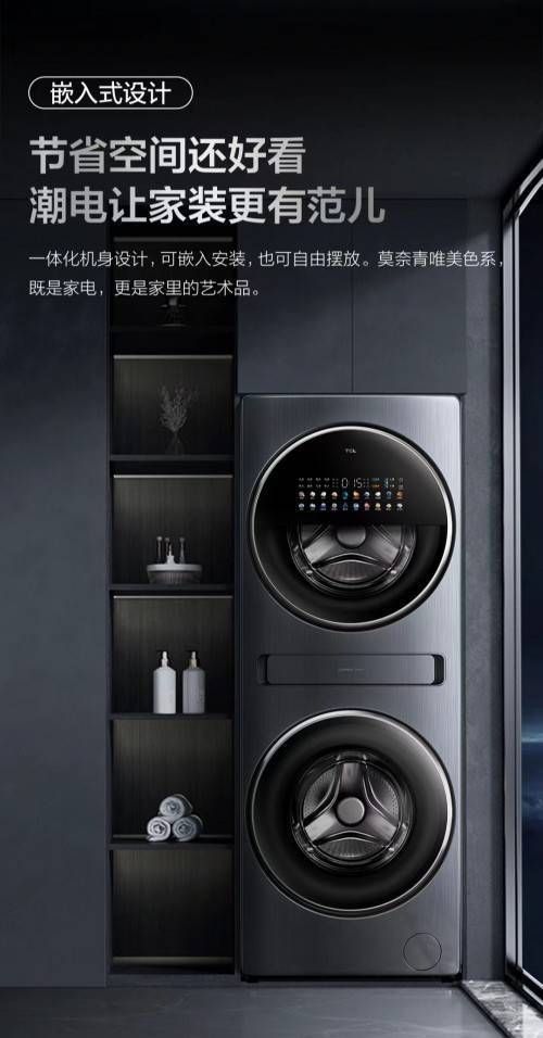 这台洗衣机采用的是莫奈青配色,视觉上给人以舒适沉稳感,搭配上彩色操作屏,整体非常有科技感,颜值超高!上下双滚筒采用对称复式设计,符合中国人的审美。它还拥有全球最大容量6KG上筒,10KG洗烘一体下筒。滚筒洗衣机主要是靠摔打的方式洗净衣服的,所以筒径越大,摔打路径越长,洗出的衣物越干净。TCL双子舱洗衣机Q10的上筒筒径为510mm,比同类产品高出40%以上,实现了1.1的超高洗净比。它的容量大,但绝不会占据大空间,它支持嵌入式安装,能让储物柜、洗衣机合为一体,因此非常节省空间!单凭这一点,我就已经心动了。