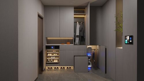 比如,晚上下班回到家,用指纹解锁开家门,玄关的灯自动亮起,包包外套挂上次净衣物消杀区,鞋柜上的内嵌式隐藏酒精喷雾,伸手即可进行手部清洁,换上拖鞋进入客厅后,扫地机器人开始工作 ……