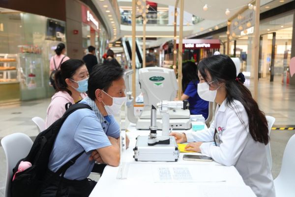 来自泰康同济医院的医生正在为一位六十多岁的大叔做眼部健康咨询,大叔感觉上了年纪老花、干眼问题越来越严重,想了解平时如何护眼,提升眼部健康。