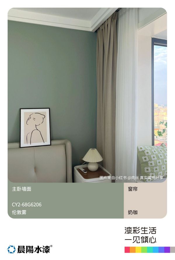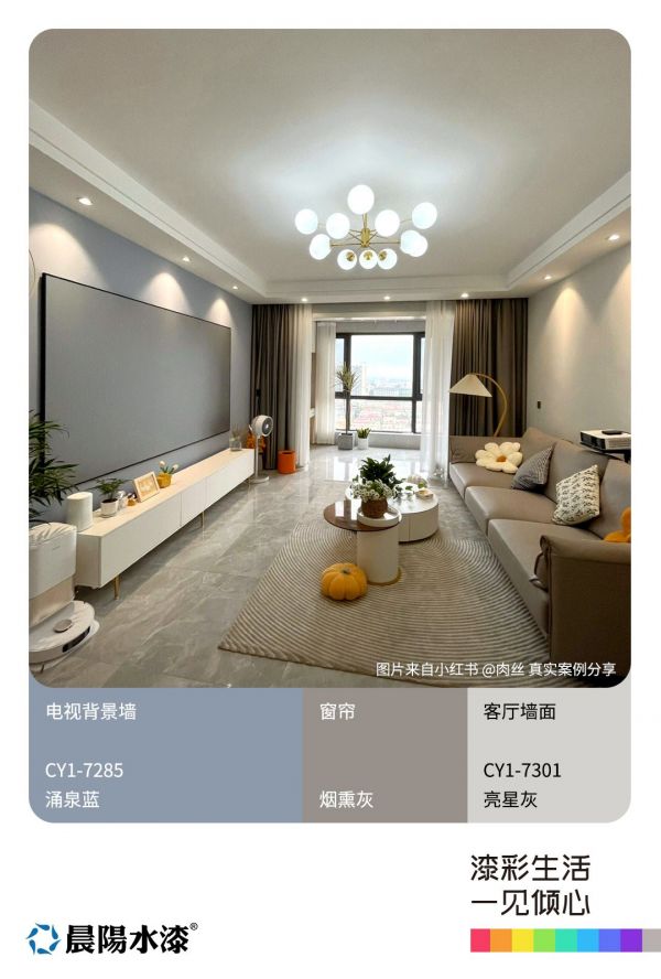 全屋晨阳水漆 墙漆色号,客厅:涌泉蓝(CY1-7285)客厅:亮星灰(CY1-7301)主卧:伦敦雾(CY2-68G6206)儿童房:褐珊瑚(CY2-64R7114)次卧:奶咖色(CY1-7301)