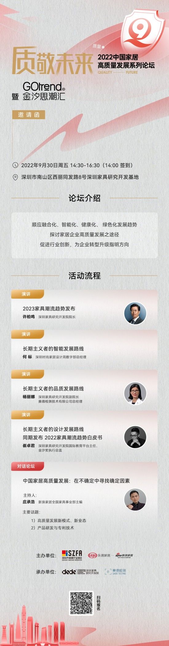 为响应工信部等四部门发布的《推进家居产业高质量发展行动方案》,顺应融合化、智能化、健康化、 绿色化发展趋势,深圳市家具行业协会、深圳市家具研究开发院与新浪家居共同发起《质敬未来:2022中国家居高质量发展论坛(家具行业)——暨GOtrend金汐思潮汇》活动,以“推动质量变革创新 促进质量强国建设 共谋中国家居高质量发展”为主题,探讨家居企业高质量发展的途径。会上,深圳家具研究开发院还将发布《2022家具潮流趋势白皮书》,促进行业创新,为企业转型升级指明方向。