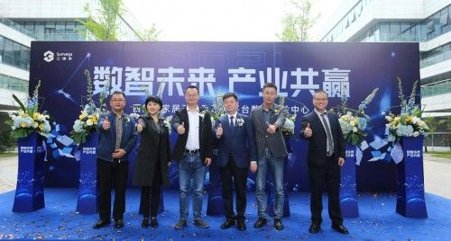 崇州市智能应用功能区管委会主任徐剑(左二)与三维家CEO蔡志森(左三)出席创新中心开幕仪式