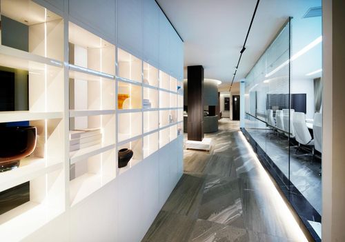 在功能区的划分上,采用了空间互溶互通的形式,使每个职能部门在保证一定必要私密性的同时,与公共空间形成很好的互动,可以高效的对接工作,玻璃材质隔墙的设计使得狭长的办公空间采光更好,更加通透,并且整体办公区在视觉上更加富有层次感。