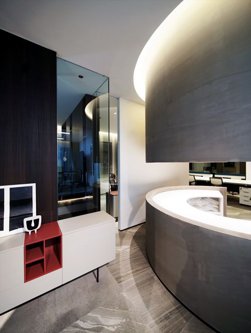 打破传统办公空间沉闷无趣的工作氛围,以舒适自由及归属感重新理解空间;空间以白色基调打底,采用沉稳的咖色系天然橡木木皮做搭配,场景中软装家具及饰品摆件穿插了具有中国文化色彩的红色,加以顶面及立面氛围灯光的使用,使得整体办公空间更加温馨舒适,具有层次感和趣味性;不同角落以不同材质的红色进行点缀搭配,以现代的表现手法诠释着历史文化的元素,使办公环境更加富有现代文化气息。