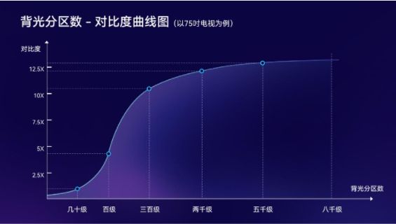 当分区背光到达三百级分区之后,对比度增长会开始放缓,直到两千级分区以上才会有明显提升。换句话说,从三百级分区到两千级分区,对画质的提升作用并没有想象的那么大。至于目前市面上部分品牌主力宣传的五百级分区,本质上与三百级分区是没有差别的。