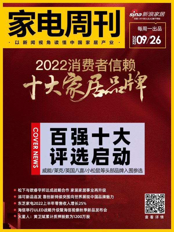 2022消费者信赖十大家居品牌百强十大评选启动,威能/莱克/英国八喜/小松鼠等头部品牌入围参选;松下与欧睿宇邦达成战略合作家装家居事业再升级;添可新品连发 靠创新持续突围向世界展现中国品牌魅力;东芝家电2022上半年零售收入增长25%;海信举行ULED战略升级暨海信视像秋季新品发布会;火星人:黄卫斌累计质押股数为1200万股……一周精彩新闻全在新浪家居家电周刊,不容错过。