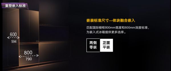 平嵌冰箱设计师系列的诞生重新定义了嵌入式冰箱的极致标准。为了防止凸出橱柜,以科技让冰箱更纤薄,在冰箱厚度上,其突破行业极限,实现了整机厚度594mm,匹配国际橱柜600mm的深度标准,可以完美嵌入橱柜,并与橱柜表面平齐。