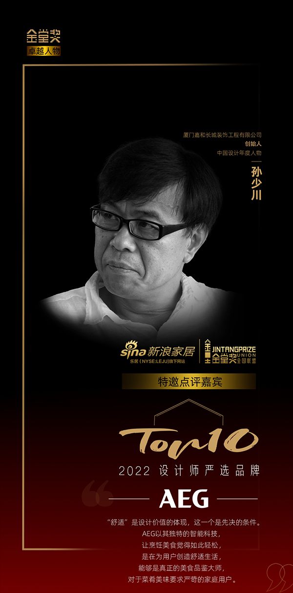 金堂奖卓越人物、厦门嘉和长城装饰工程有限公司创始人、 中国设计年度人物、金堂奖特邀点评嘉宾 孙少川先生为AEG庆贺,并点评道: “舒适”是设计价值的体现,这是一个先决的条件。对的设计不只要好看,而是要从健康、舒适、实用、低成本、低碳、提高施工效率、提升美感等多方面考量,以科学数据、科学理论做支撑。百年德国AEG以其独特的智能科技和可持续发展理念,对于菜肴美味要求严苛的家庭用户,让烹饪美食觉得如此轻松。AEG Matt Black系列厨电产品在为用户创造更舒适的生活,能够称得上是真正的美食品鉴大师。